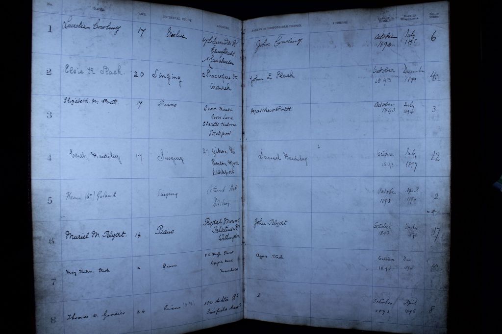The opening of the college was widely reported in the local and national presses; in London, The Pall Mall Gazette and the Evening Standard. The Courier reports that ‘the number of students is drawn from a very wide area, not only Lancashire, Cheshire and Derbyshire […] but some coming as far afield as Surrey, Gloucester, and the Isle of Wight.’ (30/09/1893, 18) In all, in that first October intake, 80 students entered the college: of the four paths of study available, 29 students chose piano, 29 students studied voice, six studied the organ, and 16 the violin. Of this group of 80 – the vast majority were women, (67 women, 12 men, and one figure whose gender is unclear).